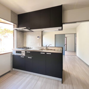 築年数が経過し、壁クロスの黒ずみや設備機器の劣化が見られる物件でした。そのため、壁や天井のクロスを全て貼り替え、キッチンやユニットバスなどの水回りも更新しました。さらに最近のリノベーショントレンドに合わせて、部屋数を減らし広々と開放感のある間取りに変更しています。