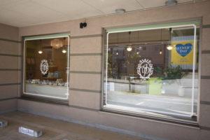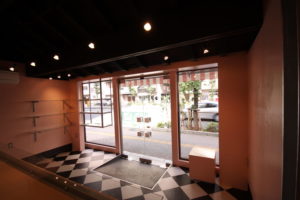 ファサードドア脇の細長いFIX窓からは、ショーケースに入ったケーキが覗き、通行人の目を楽しませるギミックとなっています。