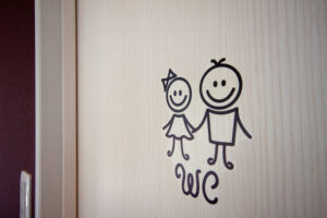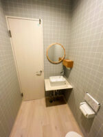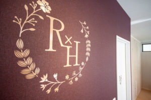 院内のえんじ色のクロスやベージュのタイルカーペット、さらに電球色の照明から、温かくやわらかい印象を感じ取れます。そしてお手洗いのサインから待合スペースまで、お子さまも楽しめる工夫がたくさん。SNS用の撮影スポットとして院内の壁に設けたゴールドのロゴも、やわらかい雰囲気に合わせてマットな色合いのものを選定しました。さらにオフホワイトの色で合わせた院内の格子と扉は、温かい雰囲気の空間に統一感をもたらしています。