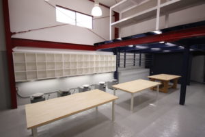 これらのキーワードから、工場(こうば)の鉄骨デザインを活かしNYのロフト風のテイストにアレンジしました。線路沿いの外壁には、その立地を生かし、デザインを考慮しながら情報発信。陶芸教室として必要な収納機能にも配慮しました。