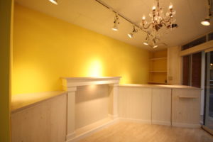 デザインのポイントは『明るさ・温かさ』というもの。色鮮やかな花(プリザーブドフラワー)が主役になるように、インテリアで用いる色数は少なめに。外からも見える位置にマントルピースを造作し、お店のポイントにしています。ストアフロントは、周囲の商店街に埋もれてしまわないように「明るいイメージ」を強く出しています。