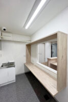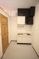 ワンルーム空間をホワイト系の色合いでまとめ、コンパクトながら広がりを感じるスタジオです。カーテンで仕切られたスペースに更衣室とシンクを配置しています。