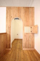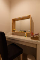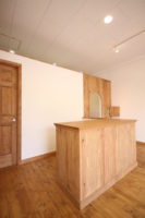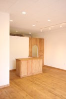 クライアント様は”すっきりしながらも木の柔らかな温もりを感じる空間”にしたいというイメージを持っていた。打合せの中で、子どもが楽しめるスペースが欲しいという話しとなり、子どもの身長に合わせた高さの小さな入口とのぞきこみたくなる小窓のあるフィッティングルームとキッズスペースを兼ねた場所ができました。