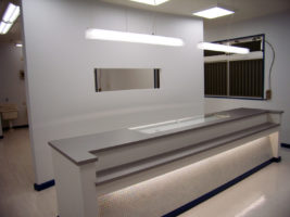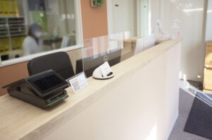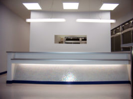 全体的にホワイトをベースにコーディネートし,店舗のイメージカラーのライトグリーンを受付横一面に入れることによって,空間に変化を持たせています。