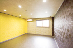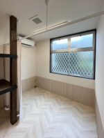 スケルトンの物件でしたので下地工事からの工事が必要な物件でした。床仕上げ材はワンちゃんに優しいクッションフロアのシリーズを採用しました。この床材は「滑りにくい」「汚れ防止」「消臭加工」などのペットに嬉しい機能が備わっています。その同じ内装材を腰壁部にも貼りました。