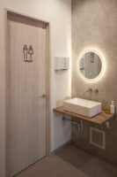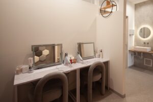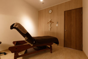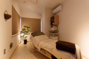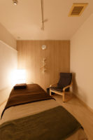 ベッドのある「施術スペース」と女性専用の「よもぎ蒸しスペース」を設け、さらには「よもぎ蒸しスペース」から「パウダースペース」へ直接アクセスできる配置にすることなど、お店を利用される方の動線を重視したプランニングとなっています。