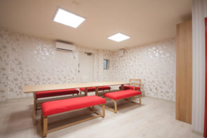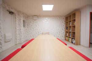 2つのスペースがあり、それぞれ雰囲気を変えた内装としました。最初に入る空間では、木板張りの柔らかく落ち着いた雰囲気に遊び心を加えたクロスを用いています。子供たちが勉強する学習スペースでは、適切な明るさを確保して色数を減らしながら、華やかな模様をアクセントとした壁面にしています。キーカラーである「赤」との相性がよいもので全体をコーディネートしました。