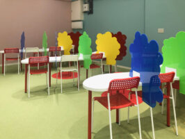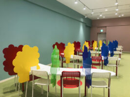学習机やアクリルパーテーションは全てオリジナルで、弊社にてデザイン・製作を行いました。壁はチョークで好きな絵や文字を書けるクロスを使用しています。