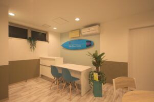 「ハワイ」「海」「エメラルドグリーン」「亀」といったキーワードをいただきファサードのデザインを行いつつ、内装のコーディネート及び工事を行いました。