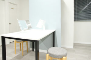 テナントの白い天井と壁を活かしつつ、新規壁のクロスとブラインドをブルーグレーにすることによって、アクセントカラーとしました。