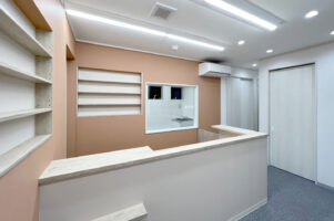 駅から歩いていくと,ブリックタイルが印象的な建物が見えてきます。この色合いとのバランスを大切にしつつ施主様の希望をヒアリングした結果,サーモンピンクをキーカラーとし,その色合いを受付カウンターの周囲の新規壁にアクセントクロスとして使用しました。