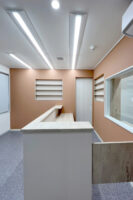 間仕切り部にもアクリル板を使用し、ワンちゃんにとっても人間にとっても閉鎖的になりすぎないような工夫をしました。塗料もOSMOカラー(自然塗料)を使用して動物にも人間にも優しい商品を使用しました。また、ホテルスペースのオープン棚はワンちゃんのサイズに合わせたクレートが置ける高さになっています。照明器具はペットの目にちらつきを感じさせないものを選定しました。外部ファサードのガラス高さは、室内からワンちゃんの目線で外が見えることを意識した高さ設定になっています。>>店舗情報はこちらよりご確認いただけます。