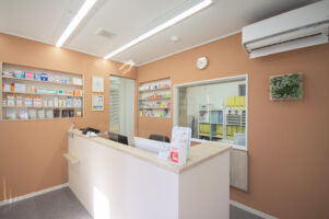 間口があまり広くないという条件の中で、情報を整理し、サービス内容、プライスリストを見やすく表示しました。レジカウンターを新規で製作し、スタッフの出入口を兼ねて、使い勝手を確保しました。