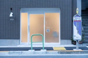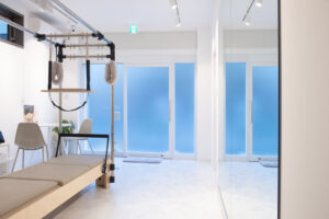 部屋のセンターにピラティスマシンがあり、トレーニングのための空間ということがシンプルに伝わります。バス停が目の前にある路面店で、店舗サインは主張しすぎず、品良くまとめています。