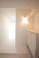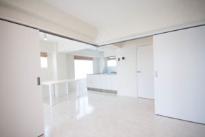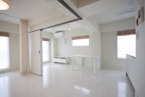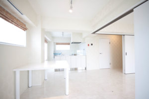 ほぼスケルトンまで内部を解体し、配置に制約のある水回りを考慮しながらレイアウトを一新しました。ホワイトを基調とした「エレガントな住空間」というコンセプト。特注の建具やテーブルを用いてオーダーメードといえるリノベーションを行いました。