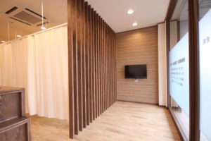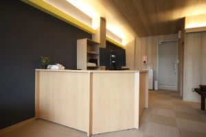 受付カウンター、カルテ棚もオーダー家具造作とし、木部塗装色とフロントの色合いを統一しトータルコーディネートしました。