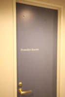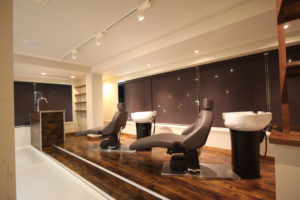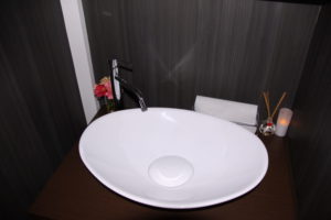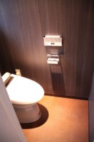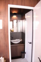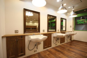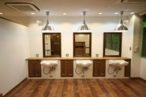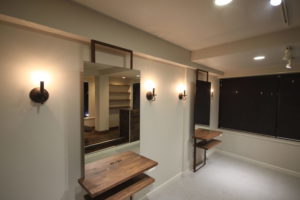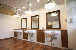 アクセントとして温かく灯る照明を吊り下げました。陽が沈むと、きらびやかな光と影を広げてまた違った顔になります。エントランスでは壁面の質感を生かしたデザインのサインボードが来店するお客様を迎えます。そして少し大人な印象のパウダールームも「もてなし」の気持ちを忘れずに。
