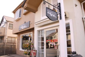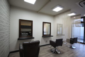 県道沿いにある美容室。優しい色合いのレッジストーンと白く明るいジョリパッド仕上げのコントラストが印象的なお店です。