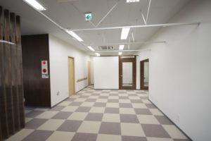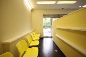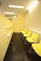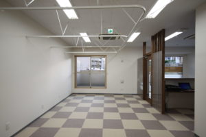 市松柄としたタイルカーペットを濃淡のある組み合わせとし、少ない色使いの中でリズミカルな雰囲気が感じられます。ストアフロントでは、テナント建物の外観も考慮し、シンプルなデザインで接骨院の存在をアピールしています。