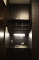 ローコストで、なおかつかっこよくというお客様のご要望にお応えし様々な工夫を施しました。元オフィスのテナントで照明やエアコンが付いていたものを全て利用し、なおかつクロスも生かせるところは利用し、新規壁部分にはアクセントクロスを貼った。カウンター内にバキュームシステムを内蔵させるように造作。ロゴデザイン・フロントデザインも弊社で行いました。