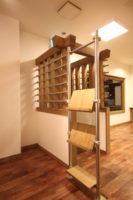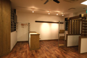 クライアント様は”すっきりしながらも木の柔らかな温もりを感じる空間”にしたいというイメージを持っていた。打合せの中で、子どもが楽しめるスペースが欲しいという話しとなり、子どもの身長に合わせた高さの小さな入口とのぞきこみたくなる小窓のあるフィッティングルームとキッズスペースを兼ねた場所ができました。
