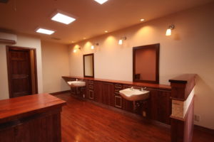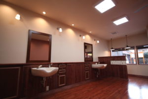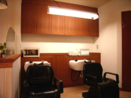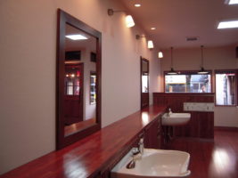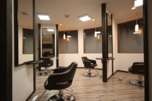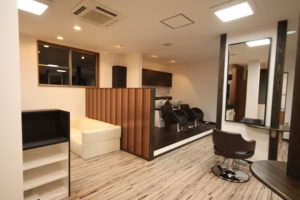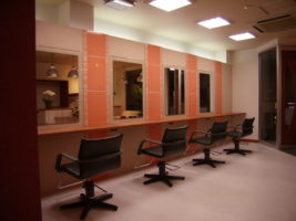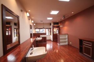 多角形なテナントに美容室を新規オープン。木造ゆえに撤去できない柱等あったが、それらを逆に活かし、多方向的なセット面のレイアウトを提案。オーナー様の当初からの意向を反映した色使いの内装を実現しました。