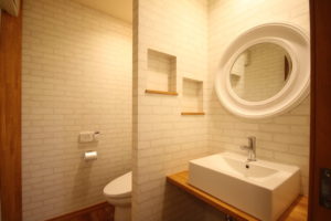 それらの要素を引き立てるデザインとしてマリンスタイルを提案。そして木の温かみも見せつつ素材感のある白を基調とするインテリアにしたいというご希望と、外部デザインを調和させるようなコーディネートとしました。