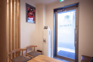 お店のテーマカラーである「なのはな」色をファサード,受付の背面にアクセントとして配色することによって,アイキャッチの効果がありつつ,店内の空間全体に温かみをもたらしています。施術室は,機材や小物のレイアウトに関してヒアリングに基づいた十分なスペースを確保しました。