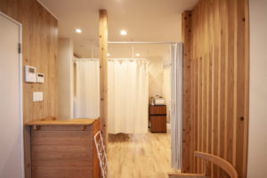 スロープやオートスライドドアを完備し、幅広い年齢層の方が来ていただけるアプローチとなっています。ナチュラルという方向性でも少し淡さを加えた色合いに調色した塗装を、カウンターや化粧柱にも施し、とても優しい雰囲気の内装・外装となりました。