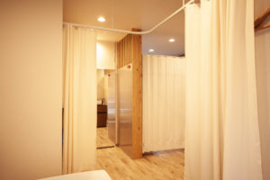 患者さまの動線、施術の流れ、収納の配置などをしっかりお打合せし、レイアウトをまとめました。前面道路に対して斜めに接するテナントという特徴も活かしつつ、空間に広がりを加えるためアール壁を取り入れています。ホワイトと木柄を基調として、施術スペースごとに異なる色合いを添えることで単調ではないリズム感を出しました。