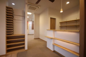 各収納部分も無垢の木の質感で統一するために、造作としました。