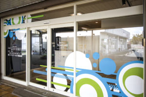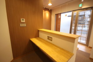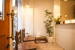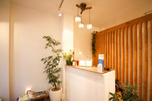 看板のベースの木部・入口ドア・内装の格子,すべての色合いを院長先生こだわりの色で統一しました。ナチュラルブラウンと白だけで,ファサードデザインと内装を仕上げたことにより,観葉植物や家具がとても引き立ちました。「プメハナ pumehana」はハワイ語で,あたたかい・ぬくもりという意味だそうですが,そんな先生の思いが詰まった,お客さまをあたたかく迎える空間とすることができました。
