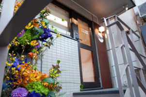 ビル全体のリノベーションと同時進行で工事しました。ブルーグレーを外部の看板と内部のアクセントカラーに使用しつつ、2階へ視線を引き上げるにはどうしたら良いかということを考慮した看板計画としました。