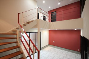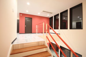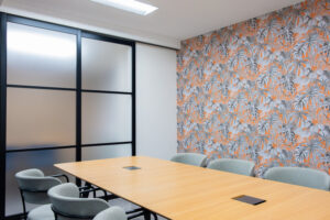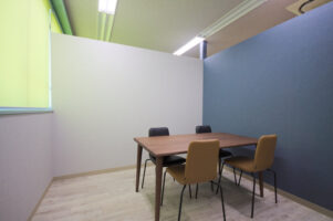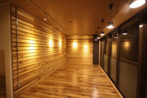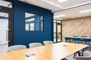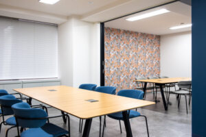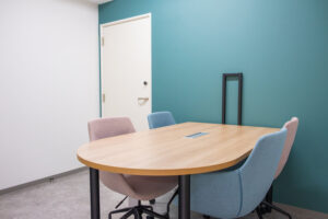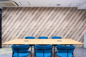新オフィスの内装は,ロゴマークのカラーリングを意識したコーディネートとしました。また,「OSB合板」調のクロスもアクセントに使用し遊び心を取り入れています。