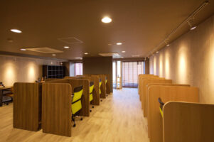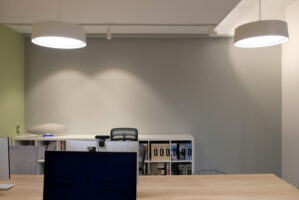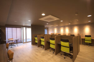 コールセンター機能を含むオフィスでしたので、デスクのレイアウトに合わせた電源や電話配線位置の計画を行いました。それと共にスタッフにとって居心地の良い落ち着いた雰囲気になるような内装コーディネートと照明のプランニングを行いました。