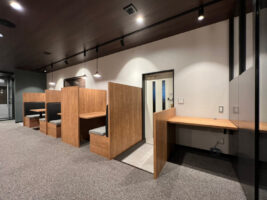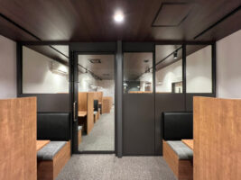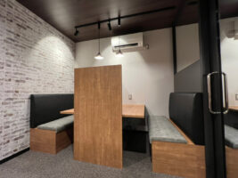 オフィスの全面リニューアルを行いました。施主様からいただいたテーマは「スタバテイストのオフィス」「ファミレス席」「部署に応じた適度な個室感」で、これらの条件をプランに反映させました。