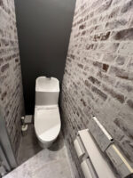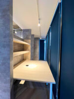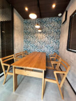 ナチュラルな色合いの荒い質感の木の雰囲気を織り交ぜつつ、ダークグレーのアクセントを効かせたコーディネートとしました。