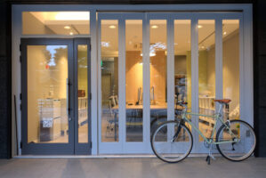 日中はオフィス・フラワーショップとして,夜はネイルサロンとしてスペースを展開。片側の壁は,無垢の羽目板壁とすることによって,棚を配置したりスワッグを吊るしたりすることができます。またオフィス空間を区切らず,可動式のパーテーションを配置したことにより,異なった用途にも対応できる空間としました。