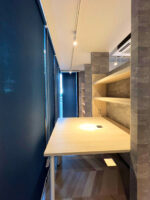 インテリアの方向性としては「西海岸インテリア」ということでしたので、ウッドのライトカラー、そしてダークトーンのブルーカラーをアクセントしてクロスやロールスクリーンを使用しています。