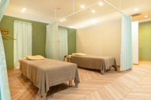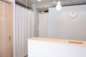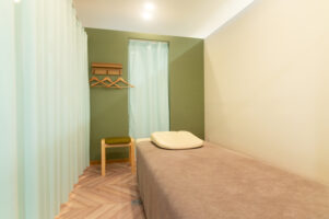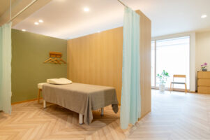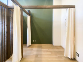 面積としては狭めの物件でしたが、柱と梁を組み合わせ、カーテンで間仕切ることで、ベッド2床分の施術スペースをしっかりと確保しつつ、施術の状況に合わせたカーテンの開閉によってフレキシブルに使える空間となるよう計画しました。