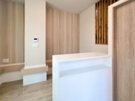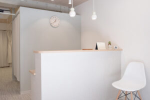 受付カウンターには曲線を取り入れて,柔らかい印象になるようにデザインしました。また施術空間はホワイトでという施主様のご要望をふまえたコーディネートとしました。