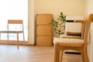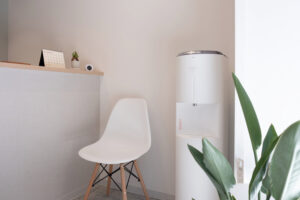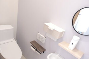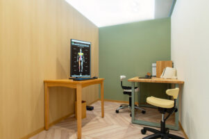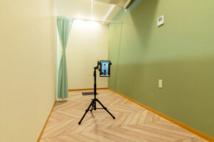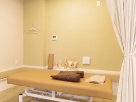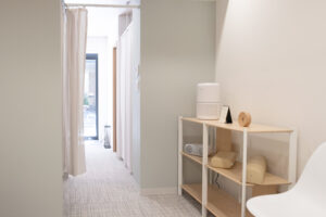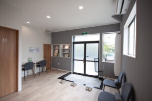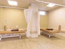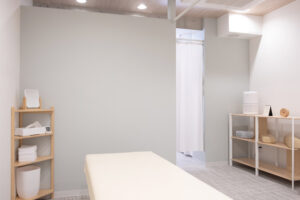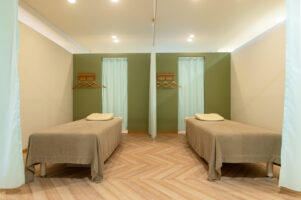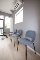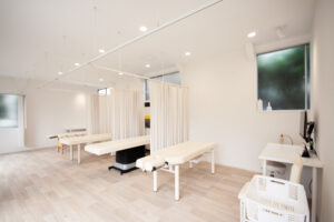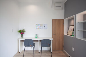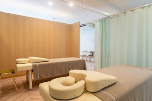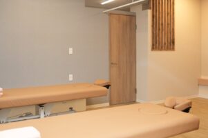 2つの施術スペースのうち、1つのスペースにはベッドを置き、もう1つのスペースは問診・待合スペースとして使えるようなプランになっています。将来的にベッドを2床使った施術もできるように、必要な寸法を確保したプランニングとしました。