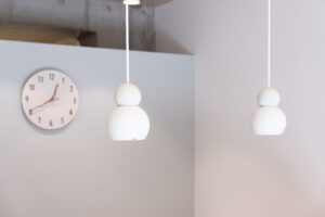 待合スペースの三連窓にはそれぞれに丸いフォルムのペンダントライトを配置し、全体的に柔らかい雰囲気に仕上げつつ、外部から見た時のアクセントとなるようにも工夫しています。