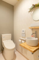 お客様から「木目を使った、高齢者にやさしいデザイン」というご要望をいただきましたので、「ホワイト」をベースに「モスグリーン」と「濃い色合いの木目」を使うことで落ち着きのある空間としました。