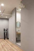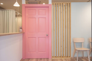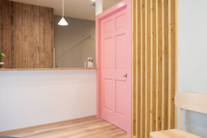 デザインのアクセントになっているのは、一目瞭然ですが「ピンクのドア」です。これを見る方は何をイメージするか。。。あれですね!施主様の熱いご要望で「なりたい自分につながるドア」として設置されました。