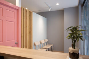 ゆとりのある待合&受付スペースでお客様を迎えます。無垢材の木格子で優しく空間を分け、院内の広がりと施術スペースの区切りをつくっています。よりプライベートな個室も取り分けています。木の雰囲気にオレンジとグリーンをアクセントに加えたカラーリングです。スケルトンから始め、天井や壁、空調や設備などをすべて新規で施工しました。