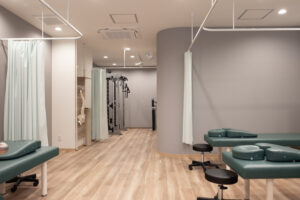 患者さまの動線、施術の流れ、収納の配置などをしっかりお打合せし、レイアウトをまとめました。前面道路に対して斜めに接するテナントという特徴も活かしつつ、空間に広がりを加えるためアール壁を取り入れています。ホワイトと木柄を基調として、施術スペースごとに異なる色合いを添えることで単調ではないリズム感を出しました。