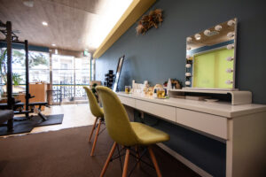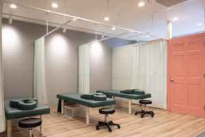 施術スペースの照明は調光機能を付け、施術時のスタイルに合わせて光量を調整できるようにしています。施術スペース間は個室感を高めつつ可動性も考慮し、縦型ブラインドで仕切っています。