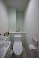 全体としてパステル調の柔らかい色合いにしながら、内外においてアイキャッチとなるように配置しています。洗面スペース・トイレの部分は曲線壁とし、奥に向かって流れがある空間としました。